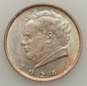 This type was struck in 1928 to commemorate the centennial of the death of composer Franz Schubert. This specimen was part of lot 32582 in Heritage sale 3035 (Long Beach, September 2014), which sold for $822.50. The catalog description[1] noted, "Republic Two Schilling Set 1928-1937, All coins UNC. Each portrays a famous individual or place in local history. One commemorative was produced each year." In 1925, the currency was reformed with 100 kronen (old) = 1 groschen (new) and 100 groschen = one schilling.