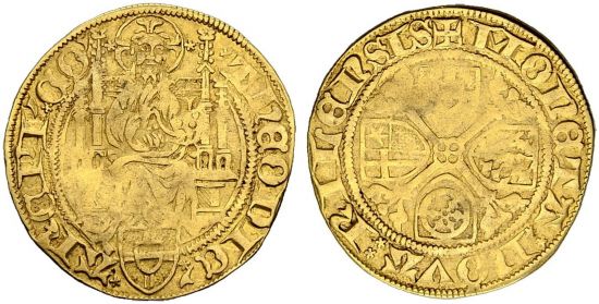 − | This specimen was lot 3210 in Sincona sale 43 ( | + | This specimen was lot 3210 in Sincona sale 43 (Zürich, October 2017), where it sold for 350 CHF (aboout US$418 including buyer's fees). The catalog description<sup>[1]</sup> noted, <blockquote>"''Köln, Erzbistum, Dietrich II. von Mörs, 1414-1463 Goldgulden o. J. (1425). Riel. Sehr schön. Flaue Stellen.'' ([[Germany]], archbishopric of Cologne, Dietrich II, 1414-63, undated goldgulden, Riel mint. Very fine, Weak areas.)"</blockquote> Both the city and the archbishop of Cologne (or Koln) issued gold ducats and it takes a keen eye to tell them apart. Friedberg notes this type as common. |