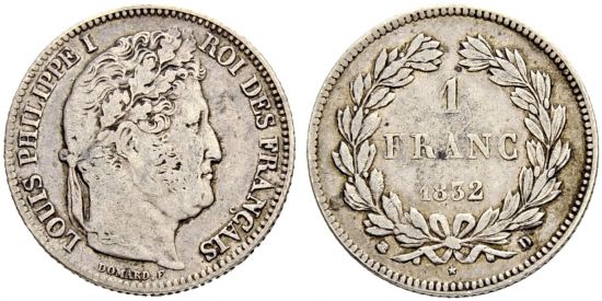 "Louis Philippe, 1830-1848. 1 Franc 1832 D, Lyon. Sehr selten. Sehr schön. (kingdom of France, Louis Philippe, 1830-48, one franc of 1832, Lyon mint. Very rare, Very fine.)"