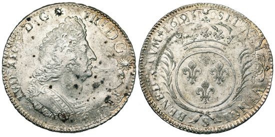 "FRANCE, Royaume, Louis XIV (1643-1715), AR écu aux palmes, 1693 S, Reims. 2e réformation. D/ B. cuir. à d. R/ Ecu de France rond, couronné, entre deux palmes. Taches au droit. Très Beau. (kingdom of France, Louis XIV (1643-1715), silver écu of the palms of 1693, Reims mint, second reformation. Obverse: armored bust right; reverse: crowned round arms of France between two palms. Stains on the obverse, Very Fine.)"