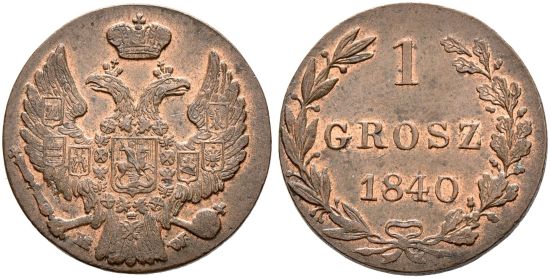 This specimen was lot 483 in Sincona sale 78 (Zurich, October 2022), where it sold for 375 CHF (about US$450 including buyer's fees). The catalog description[1] noted, "RUSSIA | Russian Empire and Federation | Nicholas I. 1825-1855, 1 Grosz 1840, Warsaw Mint, MW. Rare in this condition. Extremely fine-uncirculated." This type was struck in Warsaw 1835-41 and is fairly common in worn condition. One zloty was thirty groszy.
