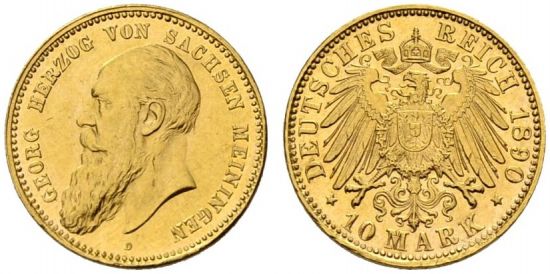 "10 Mark 1890. München Selten. Vorzüglich-gutes vorzüglich. (Germany, duchy of Saxe-Meiningen, ten mark of 1890, Munich mint, rare, extremely fine.)"