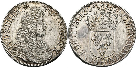 "FRANCE, Royaume, Louis XIV (1643-1715), AR écu à la cravate, 1682K, Bordeaux. 2e émission. D/ B. dr. et cuir. à d., portant une perruque et une cravate brodée. R/ Ecu de France couronné. Rare Légère trace de bélière. Beau portrait. Très Beau. (kingdom of France, Louis XIV, 1643-1715, silver écu of the necktie of 1682, Bordeaux mint, second issue. Obverse: draped and armored bust right, in a wig and embroidered necktie; reverse: crowned arms of France. Rare, light trace of jewelry use, nice portrait, Very Fine.)"