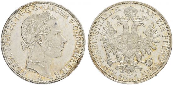 "AUSTRIA, Franz Joseph I. 1848-1916 Vereinstaler 1861 A. Wien. Vorzüglich. (empire of Austria, Francis Joseph I, 1848-1916, union thaler of 1861, Vienna mint. Extremely fine.)"