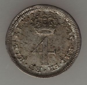This specimen was part of lot 33316 in Heritage sale 3042 (Long Beach, September 2015), which sold for $734.38. The catalog description[1] noted, "George I Four Coin Maundy Set 1727 About XF. Coins grade XF or nearly so. Evenly toned and a very scarce issue. Last year of George I's reign." Silver groats of George I were struck for circulation and Maundy sets 1717, 1721, 1723 and 1727. This denomination is still struck for the Maundy sets.