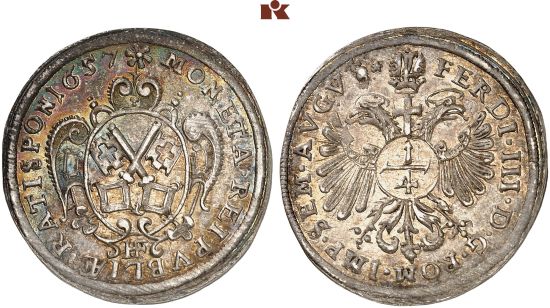 | − | This specimen was lot 3136 in Künker sale 405 ( | + | This specimen was lot 3136 in Künker sale 405 (Osnabrück, March 2024), where it sold for €2,400 (about US$3,149 including buyer's fees). The catalog description<sup>[1]</sup> noted, <blockquote>"''DIE REICHSSTADT REGENSBURG. DIE ZEIT DES KAISERS FERDINAND III. 1/4 Reichstaler 1657, mit Titel Ferdinands III. Münzmeister Hieronymus Federer. Mit REIPVBLIÆ in der Vorderseitenumschrift. Von allergrößter Seltenheit. Herrliche Patina, vorzüglich +.'' ([[German States, Regensburg|city of Regensburg]], one quarter thaler of 1657, struck in the name of Ferdinand III, with "REIPVBLIÆ" in the obverse legend. Extremely rare, superb patina, extremely fine or better.)"</blockquote> This type was struck 1657 only. None of the quarter thalers of the seventeenth century are common. |