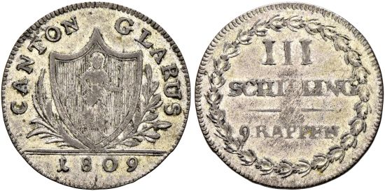 "SWITZERLAND | Glarus, 3 Schillinge 1809, Glarus. Sehr schön. (Switzerland, canton of Glarus, three schilling of 1809. Very fine.)"