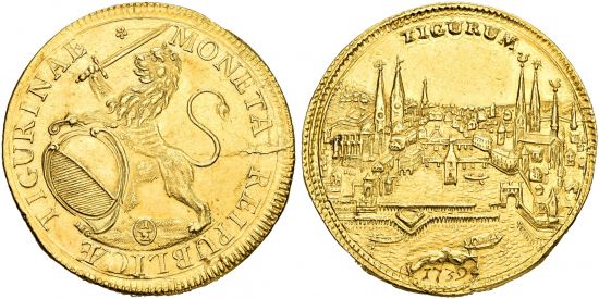 "SWITZERLAND | Zurich | Stadt und Kanton, 6 Dukaten 1739, Zürich. Abschlag vom Halbtaler. Von grösster Seltenheit. Vorzüglich. (city and canton of Zurich, six ducats of 1739, Zurich mint, struck using half thaler dies. Of the highest rarity, Extremely fine.)"