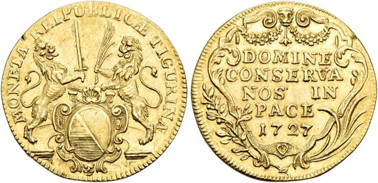 This specimen was lot 5324 in Sincona sale 80 (Zurich, October 2022), where it sold for 4,750 CHF (about US$5,693 including buyer's fees). The catalog description[1] noted, "SWITZERLAND | Zurich | Stadt und Kanton, Doppeldukat 1727, Zürich. Very rare. About extremely fine." This scarce type was struck 1718-67 along with quarter (Fr-488a), half (Fr-487a) and single ducats (Fr-486a). In 1798, the canton of Zurich was forcibly incorporated into the Helvetic Republic.