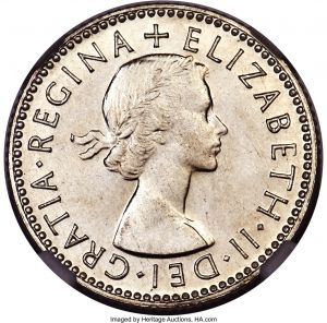 This specimen was lot 30223 in Heritage sale 3081 (New York, January 2020), where it sold for $1,560. The catalog description[1] noted, "Australia, Elizabeth II Proof 6 Pence 1954-(m) PR66 NGC, Melbourne mint. An indisputable rarity of the modern Australian series, this Proof 6 Pence ranks not only as the finest of its type and date certified by either NGC or PCGS, but reveals corresponding quality from even a cursory glance. The surfaces sparkle under light, with their beauty only accentuated by just a hint of silver patina, all while revealing virtually no handling to speak of." Sterling coinage ceased after 1964 and in 1966, the Australian dollar was introduced.