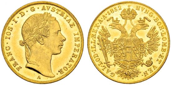 − | This specimen was lot 1028 in Sincona sale 54 ( | + | This specimen was lot 1028 in Sincona sale 54 (Zürich, May 2019), where it sold for 500 CHF (about US$595 including buyer's fees). The catalog description<sup>[1]</sup> noted, <blockquote>"''Franz Joseph I. 1848-1916. Dukat 1852 A, Wien. Gutes vorzüglich.'' (empire of Austria, Francis Joseph I, 1848-1916, ducat of 1852, Vienna mint. Good extremely fine.)"</blockquote> This type was struck 1852-59 at Vienna (shown here), [[Austria 1853-B ducat Fr-232|Kremnitz]] ("B"), [[Austria 1854-E ducat Fr-233|Karlsburg]] ("E"), Milan ("M") and Venice ("V"). This is a common date. |