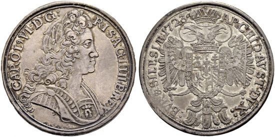 | − | This specimen was lot 4328 in Sincona sale 34 ( | + | This specimen was lot 4328 in Sincona sale 34 (Zürich, October 2016), where it sold for 550 CHF (about US$653 including buyer's fees). The catalog description<sup>[1]</sup> noted, <blockquote>"''HOLY ROMAN EMPIRE - AUSTRIA. Karl VI. 1711-1740 Taler 1723. Breslau Ohne Münzmeisterzeichen. Gutes sehr schön. Alte Tönung.'' (Holy Roman Empire, Charles VI, 1711-40, thaler of 1723, Breslau mint, without mintmaster's initials. Good very fine, old toning.)"</blockquote> This type is listed for 1723-40 but is scarce despite the lengthy production run. |