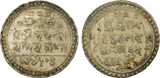 This specimen was lot 936 in Stephen Album sale 45 (Santa Rosa, CA, January 2023), where it sold for $1,020. The catalog description[1] noted, "JAINTIAPUR: Jatra Narayan, 1782-1785, AR rupee, SE1704, EF, R, ex David Cashin Collection." The state of Jaintiapur in Assam was a dependency of Cooch Behar in the sixteenth century but regained its independence in the seventeenth century. The kingdom was contended between the East India Company and Burma until 1835, when the British permanently annexed it. Coins are dated using the Shaka Era, which is the AD date minus 78 years. The SCWC lists three types for this date (KM 192, 193, 194) but does not photograph or describe them, so we will lump them all here.