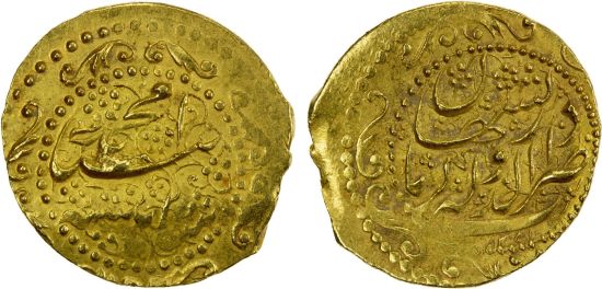 This specimen was lot 572 in Stephen Album sale 47 (Santa Rosa, CA, September 2023), where it sold for $264. The catalog description[1] noted, "QAJAR: Muhammad Shah, 1837-1848, AV toman, Kirmanshahan, AH1251, type R, with the mint epithet dar al-dawla, bent, EF, R." The Qajars were a group of Turkic origin who lived in the area of Azerbaijan. They were sympathetic to the Safavids, who ruled in Persia from 1501-1736 AD. The Qajar Dynasty began when Mohammad Khan Qajar seized Mashhad (then under Durrani suzerainty – see Afghanistan) and put an end to the Afsharid Dynasty. The Qajars were forced to fight several defensive wars against Russia, losing territory each time. Debasement was the inevitable result. The type R standard (1 toman = 3.84 g) seems to have been used AH 1250-1253 only. The SCWC notes tomans were struck to this standard at Hamadan, Isfahan, Kirmanshahan, Mashhad, Rasht, Shiraz, Tabriz and Tehran with a few half tomans.