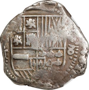 This specimen was lot 53760 in Stack's Bowers ANA sale (Pittsburgh, PA, August 2023), where it sold for $360. The catalog description[1] noted, "BOLIVIA. Cob 8 Reales, 1634-P T. Potosi Mint. Philip IV. NGC VF-20." Royals are known of this type from the Potosi mint but all are rare. The regular cob issues are not nearly as nice. The years 1649-52 were a period of reform at the Potosi mint; it was found that the previous mintmasters in office 1625-48 had been debasing the cobs, a crime for which one official paid with his life. Assayer T is noted for 1627-49, so he was likely involved.