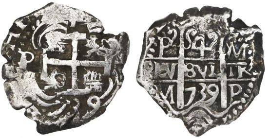 This specimen was lot 530 in Sedwick Treasure Auction 26 (Winter Park, FL, November 2019), where it sold for $464.10. The catalog description[1] noted, "Potosí, Bolivia, cob 4 reales, 1739M, NGC VF 35. Choice full pillars and cross with two dates and assayers, three mintmarks, deep toning and encrustation in crevices, typically crude edge, overall more like XF in our estimation." The Spanish colony of Upper Peru produced hammered cob coinage at the Potosí mint from 1573 to 1773, with a major debasement scandal and subsequent reform occurring in 1649-1652. The period 1767-1770 saw the simultaneous issue of milled columnarios. The royal or presentation issues are very rare and highly sought after, while the regular strikes vary in price according to the visibility of the date, mint, and assayer initials.
