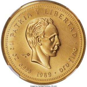 This specimen was lot 33413 in Heritage sale 3114 (New York, January 2024), where it sold for $2,100. The lot description[1] noted, "Cuba. Republic gold "Jose Marti" 50 Pesos (1/2 oz) 1989 MS69 NGC, Havana mint. One of several representatives from the recognizable "Patria Y Libertad" series in this sale, this piece bathed in a soft orange tone and tied at the penultimate grade on the NGC census." Desperate for foreign exchange, Cuba has issued large numbers of NCLT's, many only vaguely related to Cuba. Martí, best known as the author of "Guantanamera", has been adopted as a hero of the Cuban revolution, tho it seems unlikely that he would have much sympathy with the Communists. The bust used here originally appeared on the Cuban gold issues of 1915-16, minted in Philadelphia. It was struck 1988-90 along with a 25 and 100 pesos.
