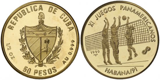 "* 1990. Cuba. 50 pesos. AU. XI Juegos Panamericanos - Volleyball. Acuñación de 15 ejemplares. Muy rara. Proof. (Cuba, fifty pesos of 1990, gold, eleventh Panamerican Games--Volleyball; mintage of 15 pieces, very rare, proof.)"