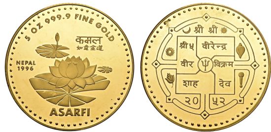 * [[Nepal VS2052 1/20 asarfi|VS 2052/1995 1/20 asarfi, 1/20 oz gold, Lord Buddha]] | * [[Nepal VS2052 1/20 asarfi|VS 2052/1995 1/20 asarfi, 1/20 oz gold, Lord Buddha]] | ||