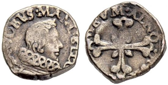 − | This specimen was lot 1636 in Sincona sale 59 ( | + | This specimen was lot 1636 in Sincona sale 59 (Zürich, October 2019), where it sold for 300 CHF (about US$363 including buyer's fees). The catalog description<sup>[1]</sup> noted, <blockquote>"''ITALY | Maccagno, Giacomo III. Mandelli (1618-1645). Sesino o. J. Maccagnio. IACOBVS MANDEL C M Büste nach rechts. Rv. AAVXILIVM MEVA A DNO Lilienkreuz. Sehr selten. Sehr schön.'' ([[Italy]], lordship of Maccagno, Jacob III Mandelli, 1618-45, undated sesino, Maccagno mint. Obverse: bust right; reverse: floriate cross. Very rare, Very fine.)"</blockquote> The county of Maccagno, on the east bank of Lago Maggiore, lies in the duchy of [[Italy, Milan|Milan]]. The count obtained the mint right in 1622 and proceeded to mint fifteen different gold coins in the next few years. All are rare today. This sesino was six denari or half a soldo. |