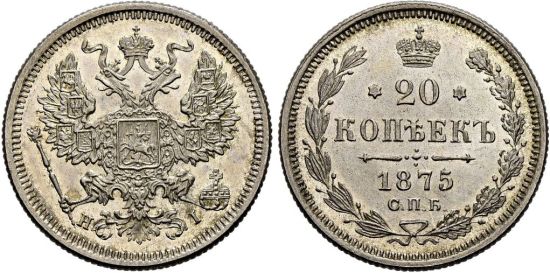 | − | This specimen was lot 453 in Sincona sale 84 ( | + | This specimen was lot 453 in Sincona sale 84 (Zürich, October 2023), where it sold for 375 CHF (about US$505 including buyer's fees). The catalog description<sup>[1]</sup> noted, <blockquote>"[[Russia|RUSSIA]] Russian Empire and Federation, 20 Kopecks 1875, St. Petersburg Mint, SPB NI. NGC MS65. Nicely toned."</blockquote> In 1867, the weight of the twenty kopeks was reduced from 4.14 g, 0.750 fine silver to 3.60 g, 0.500 fine silver and struck in that form until the collapse of the regime. None were made 1894-1900. |