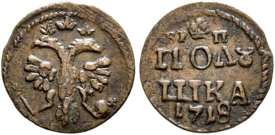 − | This specimen was lot 64 in Sincona sale 78 ( | + | This specimen was lot 64 in Sincona sale 78 (Zürich, October 2022), where it sold for 250 CHF (about US$300 including buyer's fees). The catalog description<sup>[1]</sup> noted, "[[Russia|RUSSIA]] | Russian Empire and Federation | Peter I. 1682-1725, Polushka 1718, Kadashevsky Mint. 1 roubles according to Petrov. About extremely fine." This polushka, or quarter kopek, was struck 1718-22. The mintages are unknown but must have been substantial as the type is not rare today. Another polushka, struck 1718-20 with initials ΗД (KM 152.1), lacks a shield on the eagle's breast. |