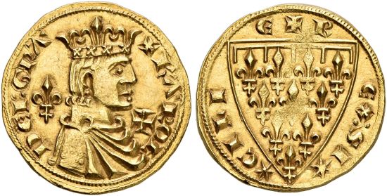| − | This specimen was lot 2797 in Sincona sale 80 ( | + | This specimen was lot 2797 in Sincona sale 80 (Zürich, October 2022), where it sold for 50,000 CHF (about US$59,925 including buyer's fees). The catalog description<sup>[1]</sup> noted, <blockquote>"''ITALY | [[Italy, Naples & Sicily|Sicily]], Carlo I d'Angio, 1266-1282. Reale d'oro o. J. (um 1266-1282), Barletta. + KAROL - DEI:GRA Gekröntes Brustbild mit Drapierung und Kürass nach rechts, im linken Feld Lilie, im rechten Feld Kreuz. Rv: + R - EX : SI Stern - Stern CILI - E, Lilienwappen. Äusserst selten. NGC MS63. Prachtexemplar.'' ([[Italy]], kingdom of Sicily, Charles of Anjou, 1266-82, undated gold real, circa 1266-82, Barletta mint. Obverse: draped, armored and crowned bust right, lily in the left field, cross in the right field; reverse: lilies on arms. Extremely rare, Cabinet piece.)"</blockquote> Charles of Anjou was the brother of the king of France and came to Italy with an army, looking for a kingdom to conquer. Note the arms of France on the reverse with the label of difference. He was evicted from Sicily in 1282 during the Sicilian Vespers. |