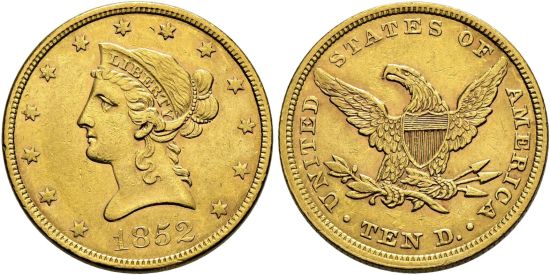 − | This specimen was lot 3252 in Sincona sale 87 ( | + | This specimen was lot 3252 in Sincona sale 87 (Zürich, October 2023), where it sold for 850 CHF (about US$1,145 including buyer's fees). The catalog description<sup>[1]</sup> noted, <blockquote>"USA, 10 Dollars 1852, Philadelphia. Liberty head. Very fine."</blockquote> This specimen is one of a type struck without motto at the Philadelphia mint 1839-66. Issues are also recorded from New Orleans (1841-60) and San Francisco (1854-66). In 1866, the motto "In God We Trust" was added to the reverse. The 1852 is a very scarce date despite the substantial mintage. |