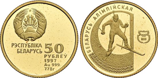 "WEISSRUSSLAND Republik, seit 1991. 50 Rubel 1997, Warsaw Mint. 7.82 g. Olympia Belarus. Biathlet. Sehr selten. Nur 500 Exemplare geprägt, Polierte Platte. Im Originaletui mit Zertifikat, Very rare. Only 500 pieces struck, Choice Proof, In original box with certificate."