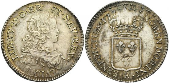 | + | * [[France 1721-E 1/2 ecu|1721-E ''demi-écu au grand écusson de France'']] | ||