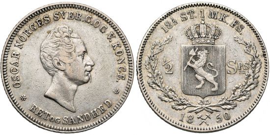 "NORVEGE, Oscar Ier (1844-1859), AR 1/2 speciedaler, 1850. Petits coups sur la tranche. presque Très Beau. (kingdom of Norway, Oscar I, 1844-59, silver half speciedaler of 1850. Small rim nicks, about Very Fine.)"