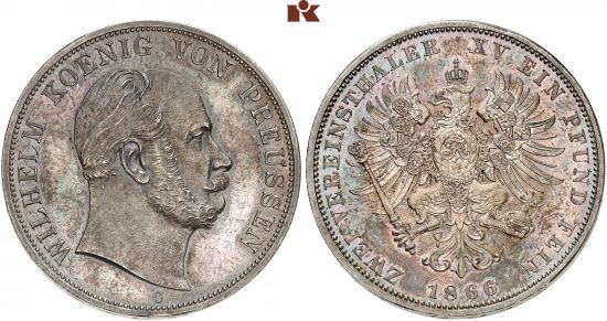 "BRANDENBURG-PREUSSEN, PREUSSEN, KÖNIGREICH, Wilhelm I. 1861-1888. Doppelter Vereinstaler 1866, C. Dunkle Patina, kl. Kratzer, fast Stempelglanz aus polierter Platte. Exemplar der Slg. Friedrich Otto, Rittergut Passendorf, Auktion Fritz Rudolf Künker 126, Osnabrück 2007, Nr. 2582. (Germany, kingdom of Prussia, William I, 1861-88, double union thaler of 1866. Dark toning, minor scratches, about uncirculated on a proof planchet.)"