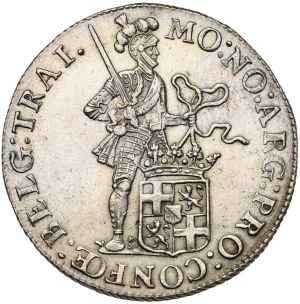 "NEDERLAND, UTRECHT, Provincie, AR zilveren dukaat, 1794. Vz/ Staande ridder r. met zwaard en provinciewapen. Kz/ Gekroond Generaliteitswapen. Licht gereinigd. bijna Prachtig. (Netherlands, province of Utrecht, silver ducat of 1794. Obverse: standing knight with sword and provincial arms; reverse: crowned arms of the Generality. Lightly cleaned, about extremely fine.)"