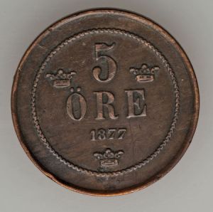 This specimen was part of lot 23262 in Heritage sale 3010 (Boston, August 2010), which sold for $503.70. The catalog description[1] noted, "Mixed Scandinavian 14 Coin Lot, ...Sweden ...5 Ore 1877(two pieces), ...Grades are Fine-XF. A lot that needs careful study." This type was minted 1874-1900. This subtype with a small obverse legend was issued 1874-89. The type is fairly common but this date is scarce.