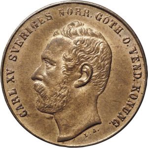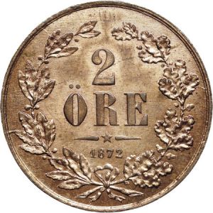 This specimen was lot 31824 in Heritage sale 3029 (New York, January 2014), where it sold for $282. The catalog description[1] noted, "Carl XV 2 Ore 1872, MS64 Red Brown NGC. A choice example with nearly full mint brilliance, highly elusive with so much mint red. Ex: 'Colonel' E.H.R. Green; Green Estate' Partnership of Eric P Newman / B.G. Johnson." In the reform of 1830, the sixth and third riksdalers were dropped for eighth, quarter and half riksdalers. The skilling, formerly 1/48 riksdaler, became 1/128 riksdaler and new one-sixth, one-third, half, two-thirds, one, two and four skilling issued in copper. The smallest silver denomination, the 1/32 riksdaler, was four skilling. In 1855, the skilling was dropped and 400 öre = 4 riksdaler riksmynt = 1 riksdaler species (the riksdaler species remained unchanged). In 1873, the riksdaler species was dropped and 100 öre = 1 krona (the krona, at 7.5 g, 0.800 fine silver, was slightly smaller than the old riksdaler riksmynt). This type is listed for 1860-72 and this is the commonest date. An 1872/1 overdate is noted.