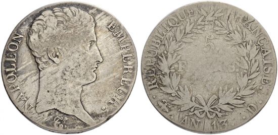"Frankreich, I. Kaiserreich. Napoleon I. 1804-1815. 5 Francs AN 13 (1804-1805) D, Lyon. Selten. Schön. (France, first empire, Napoleon I, 1804-15, five francs of the year 13, Lyon mint. Rare, Fine.)"