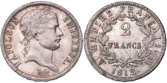 "FRANCE, Napoléon Ier (1804-1814), AR 2 francs, 1812 W, Lille. Traces d'ajustage. Rare dans cette qualité. Superbe. (empire of France, Napoleon I, 1804-14, silver two francs of 1812, Lille mint. Traces of adjustment marks, rare in this quality, Extremely Fine.)"