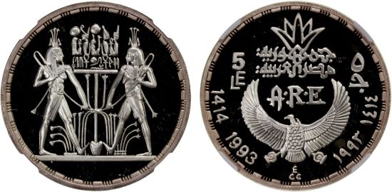 This specimen was lot 2364 in Stephen Album sale 43 (Santa Rosa, CA, May 2022), where it sold for $264. The catalog description[1] noted, "EGYPT: Arab Republic, AR 5 pounds, 1993/AH1414, Ancient Egypt Civilization - Symbol of Unification, NGC graded Proof 69 Ultra Cameo." This NCLT is among dozens issued by the regime in 1993-94 to honor ancient Egyptian culture. Many of the designs were also used on gold fifty pounds.