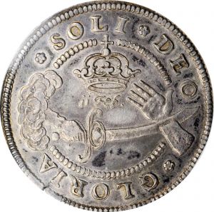This specimen was lot 21139 in Stack's Bowers ANA sale (Las Vegas, August 2020), where it sold for $2,640. The catalog description[1] noted, "DENMARK. Krone (4 Mark), 1659. Frederik III. PCGS EF-45 Gold Shield. A well struck and nicely preserved example of the type with lovely old cabinet tone. The piece exhibits nice bold design features with even wear on the high points, only a couple of insignificant areas of weakness on the reverse are noticed mentioned for accuracy. The surfaces exhibit lovely mottled gray patina with blue and golden hues offering good eye appeal. Clearly an example which sat for a prolonged period of time undisturbed." This is one of several closely related kroner or four mark pieces issued 1659-60 (Dav-3576, Dav-3576A and Dav-3578). King Frederick III ruled 1648-70; one may assume the obverse design had political significance at the time. Danish crowns of the seventeenth century range from the scarce to the obscenely rare. Either they were melted extensively or the poverty of the king prevented large issues or both. The similar Dav-3578 has "DOMINVS PROVIDEBIT" around the king's monogram instead of the "*IIII*MARCK*DANSKE*" shown here.