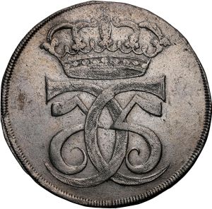 This specimen was lot 10282 in Stack's Bowers Collectors Choice Online Auction (Costa Mesa, CA, February 2025), where it sold for €288 (about US$300). The catalog description[1] noted, "DENMARK. Krone, 1684-GS. Copenhagen Mint. Christian V. NGC AU Details--Cleaned. From the L. E. Bruun Collection." This type was struck 1684-85, all with initials "GS"; varieties exist in the size of the shield and the punctuation after "IUSTITIA". Christian V was king of Denmark and duke of Schleswig-Holstein. Two mark was half a krone or one-third speciedaler.