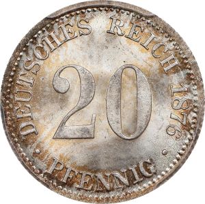 This specimen was lot 46149 in Stack's Bowers ANA sale (Chicago, August 2024), where it sold for $145. The catalog description[1] noted, "GERMANY. Empire. 20 Pfennig, 1876-F. Stuttgart Mint. Wilhelm I. PCGS MS-67." Under the German Empire of 1871-1918, the denominations of two mark and up were permitted for the formerly independent principalities while the lower denominations (one pfennig thru one mark) were minted to a unified design. This issue of the Stuttgart mint is a common date of a type struck 1873-77. When the twenty pfennig was revived in 1887, it was in copper-nickel (KM 9.1).