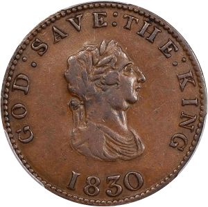 This specimen was lot 57307 in Stack's Bowers NYINC sale (New York, January 2024), where it sold for $168. The catalog description[1] noted, "ISLE OF MAN. 1/2 Penny Token, 1830. George IV. PCGS AU-50." The bust shown here is one of George III, borrowed from Boulton issues of 1813. This issue accompanied a penny token. Some of the issue had an Arabic numeral 1 and round 3 in the date (KM Tn17).