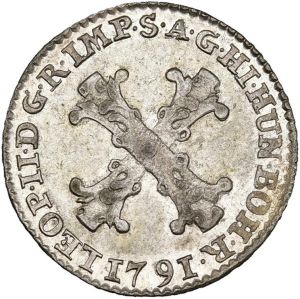 "BRABANT, Duché, Léopold II (1790-1792), AR 10 liards, 1791, Bruxelles. D/ Croix de Bourgogne. R/ Écu couronné, entouré du collier de la Toison d'or. (duchy of Brabant, Leopold II, 1790-92, silver ten liards of 1791, Brussels mint. Obverse: Burgundian cross; reverse: cronwed arms, order of the Golden Fleece around. Very Fine - Extremely Fine.)"