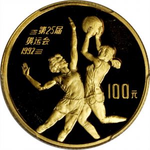 This specimen was lot 6233 in Stack's Bowers NYINC sale (New York, January 2017), where it sold for $399.50. The catalog description[1] noted, "CHINA. 100 Yuan, 1990. Olympic Series. PCGS PROOF-68 DEEP CAMEO Secure Holder." The Chinese government has, since the mid 1980's, produced a mind boggling array of bullion related collectibles. A complete set is thousands of types yet buyers clamor for more. This NCLT honored the 1992 Summer Olympic Games in Barcelona and features women's basketball.