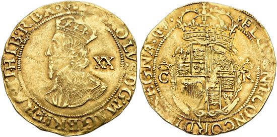 This specimen was lot 101 in Sincona sale 75 (Zürich, May 2022), where it sold for 11,000 CHF (about US$13,352 including buyer's fees). The catalog description[1] noted, "Grossbritannien | Königreich. Charles I. 1625-1649. Unite of 20 Shillings n. d. (1644-1645), Tower Mint under Parliament. Group F. Sixth bust. Mintmark R in brackets. Selten. NGC MS60. Überdurchschnittliche Erhaltung. (Rare, Extraordinary condition.)" Even after the king broke with Parliament and fled to Oxford, the Tower mint (controlled by Parliament) continued to strike silver and gold coinage of the pre-Civil War types. This unite is an expensive type but is more available than the Royalist issues.