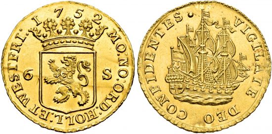 "THE NETHERLANDS | Province of Holland. 2 Dukaten 1752. Abschlag von den Stempeln des Scheepjesschelling (6 Stüber). Seltener Jahrgang. Vorzüglich. Fassungsspuren. (Netherlands, province of Holland, double ducat of 1752, off-metal strike on six stuiver dies. Rare date, Extremely fine, Traces of mounting.)"