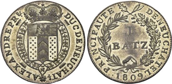 "SCHWEIZ Neuenburg/Neuchâtel, Unter französischem Regime, Alexandre Berthier, Prince de Neuchâtel, 1806-1814. Batzen 1809, Neuchâtel. Vorzüglich. (Switzerland, principality of Neuchâtel, under French occupation, prince Alexander Berthier, 1806-14, batzen of 1809, Neuchâtel mint. Extremely Fine.)"
