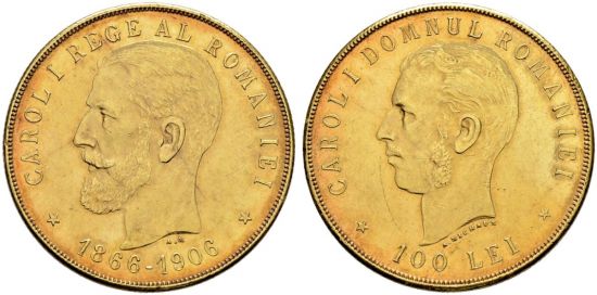 "RUMÄNIEN. Carol I. 1866-1914 100 Lei 1906. 40. Regierungsjubiläum. Vorzüglich. Kl. Kratzer. (Romania, Carol I, 1866-1914, one hundred lei of 1906, on the fortieth anniversary of the reign. Extremely fine, Minor scratches.)"
