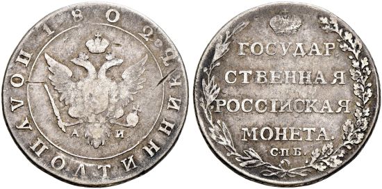 This specimen was lot 400 in Sincona sale 78 (Zürich, October 2022), where it sold for 250 CHF (about US$300 including buyer's fees). The catalog description[1] noted, "RUSSIA | Russian Empire and Federation | Alexander I. 1801-1825, Polupoltinnik 1802, Banking Mint, SPB AI. 2.25 roubles according to Petrov. Fine. Small scratches." The SCWC records this product of the St. Petersburg mint (СПБ) for 1802-05, with mintmaster AI (AИ) operating 1799-1803. The type is much scarcer than the contemporary rubles (Dav-279). The denomination was terminated in 1810, to be superseded by the twenty-five kopeks in 1827.