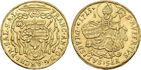 This specimen was lot 3449 in Sincona sale 83 (Zürich, May 2023), where it sold for 710 CHF (about US$950 including buyer's fees). The catalog description[1] noted, "Salzburg, Erzbistum, Franz Anton von Harrach, 1709-1727. Dukat 1715, Salzburg. Fast vorzüglich. Kleine Kratzer und Randfehler (archbishopric of Salzburg, Franz Anton von Harrach, 1709-1727, ducat of 1715, Salzburg mint. About extremely fine, Small scratches and edge nicks)." The Archbishopric of Salzburg was an ecclesiastical state between Bavaria and Austria and usually ruled by a Hapsburg client. This type was struck 1709-26 and is slightly more common than the ducat with the bust obverse (Fr-842). In the seventeenth century, Salzburg was blessed with a number of productive silver mines and the prince-archbishop was a prolific issuer of coins, particularly thalers. The archbishopric was secularized in 1803 and passed to Austria in 1814.